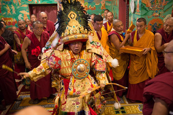 तिब्बत के नेछुंग विहार में जिस तरह समारोह मनाया जाता था उसी के प्रतिरूप स्वरूप तन्द्रा में ऊर्जावान भविष्यवाणी कर्ता पालकी पर रखे गुरु पद्मसंभव की एक मूर्ति के साथ मंदिर की प्रदक्षिणा करने निकले। वे लौटे और पुनः परम पावन के पास गए। जैसे उनकी तंद्रा स्थिति समाप्त होने आई तो उन माध्यमों को शीघ्र ही बाहर ले जाकर उनकी विस्तृत वेशभूषा से मुक्त कर दिया गया। अपनी सामान्य स्थिति में लौटकर, माध्यमों ने पुनः मंदिर के अंदर प्रवेश किया और आभार के प्रतीक स्वरूप एक रेशमी स्कार्फ प्राप्त किया।