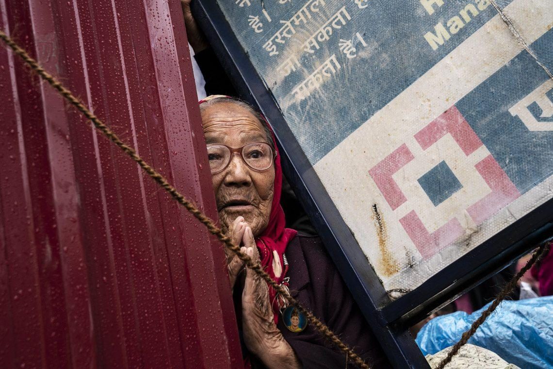 परमपावन दलाई लामा द्वारा आर्यअवलोकितेश्वर अभिषेक प्रदान करने की सभा में एक श्रद्धालु बारिश से बचाव के लिए बनाये गये चबुतरे से परमपावन को निहारती हुयीं । मनाली, हि. प्र. भारत । १७ / अगस्त /२०१९ चित्र- तेनज़िन छोएजोर
