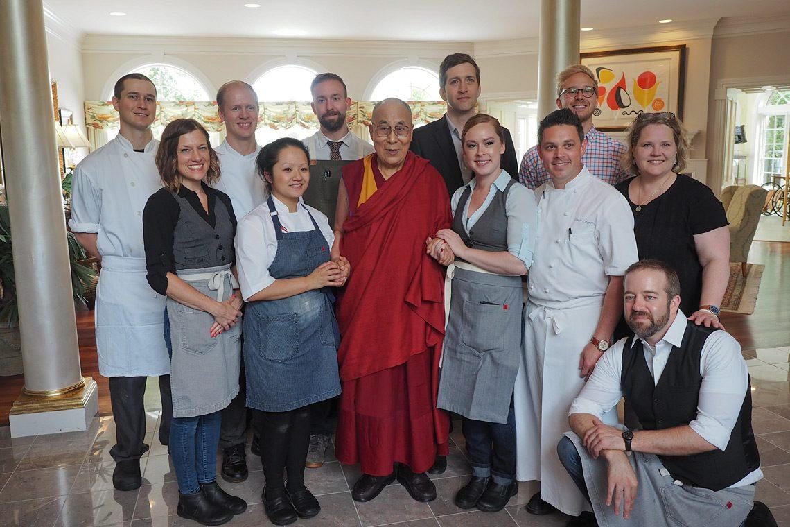 परम पावन दलाई लामा मध्याह्न भोजनोपरांत रसोई घर के कर्मचारियों के साथ, मिनियापोलिस, मिनेसोटा, संयुक्त राज्य अमेरिका, जून २३, २०१७ चित्र/जेरमी रसेल/ओएचएचडीएल