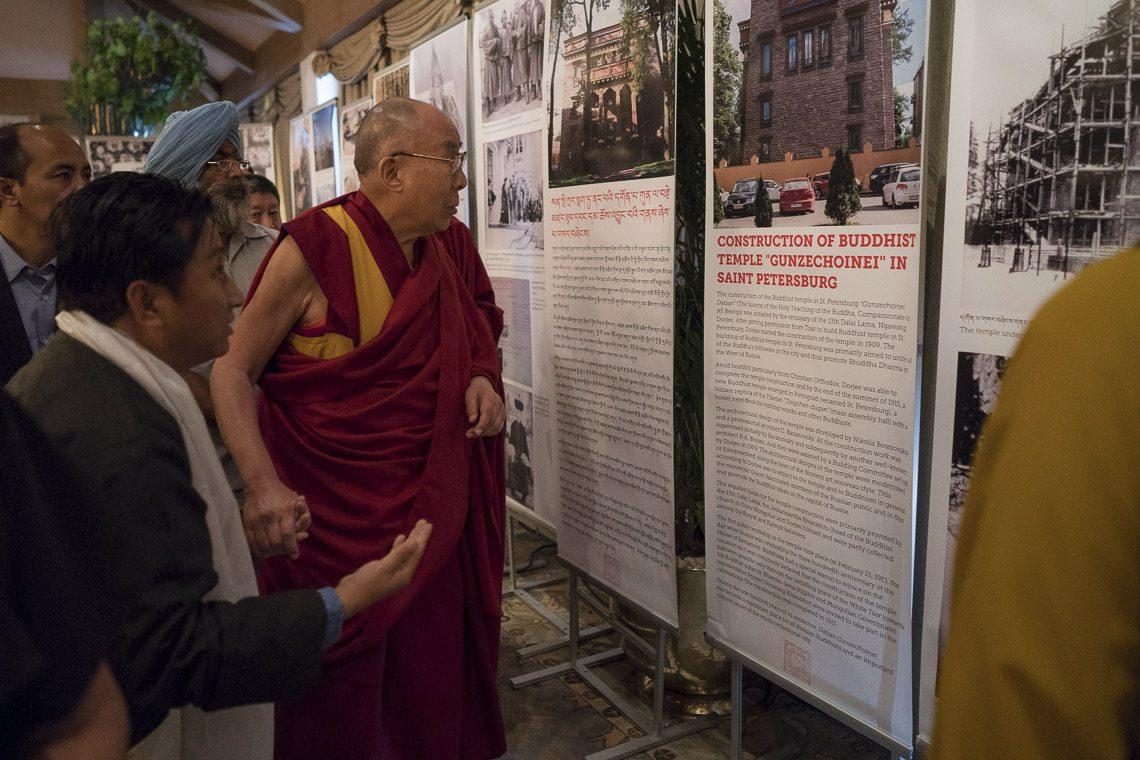 परम पावन दलाई लामा रूसी वैज्ञानिकों के साथ संवाद के लिए बैठक कक्ष में प्रदर्शित चित्र प्रदर्शनी देखते हुए, नई दिल्ली, भारत, अगस्त ७, २०१७ चित्र/तेनज़िन छोजोर/ओएचएचडीएल