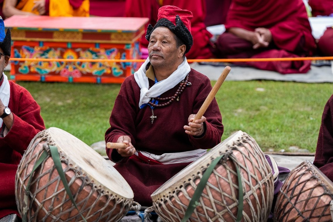 23 जुलाई 2023 को लेह, लद्दाख,भारत स्थित जिवेत्सल प्रवचन स्थल पर परम पावन दलाई लामा के आगमन की प्रतीक्षा करता हुआ एक पारंपरिक ढोल वादक।फोटो-तेंजिन छोइजोर