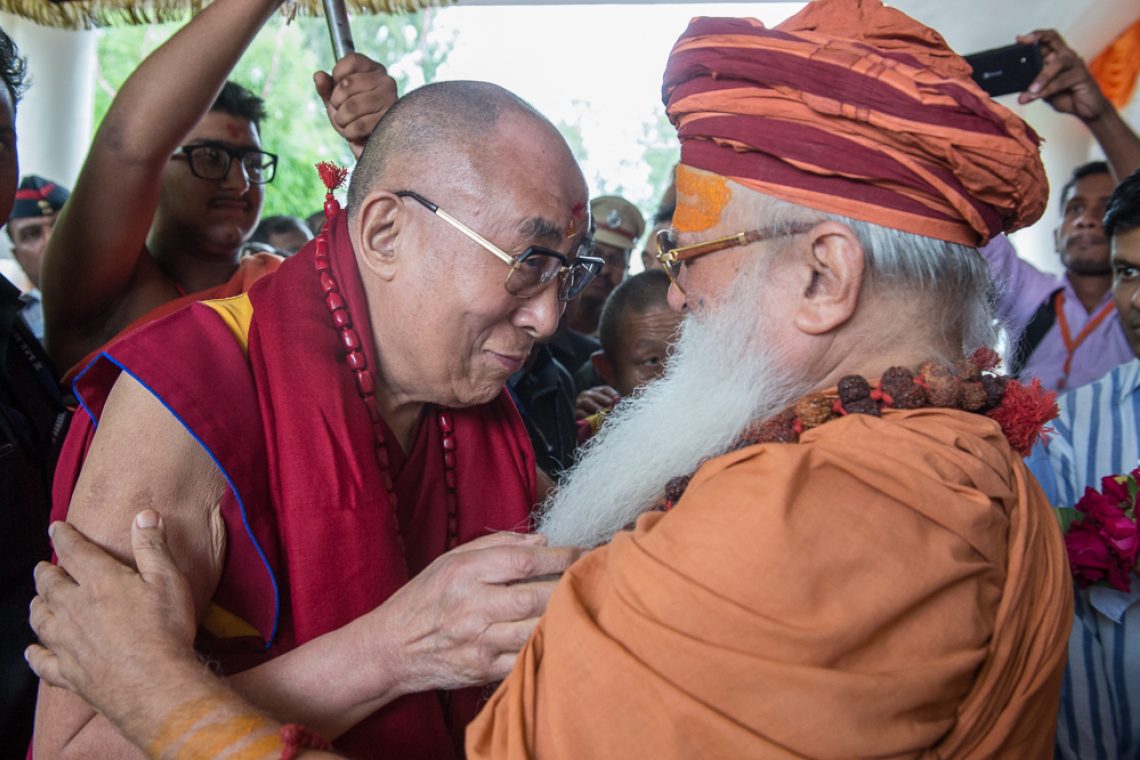 परम पावन दलाई लामा और स्वामी कर्षणी गुरु शरणानन्द उनके आगमन पर पारस्परिक रूप से अभिनन्दन करते हुए, त्र्यम्बकेश्वर, महाराष्ट्र, भारत - अगस्त ३०, २०१५ चित्र/तेनज़िन छोजोर/ओएचएचडीएल